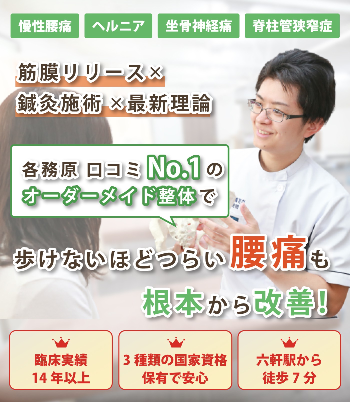 慢性的な腰痛、椎間板ヘルニア、ぎっくり腰、坐骨神経痛など腰痛の経験施術が豊富な整体院です。
