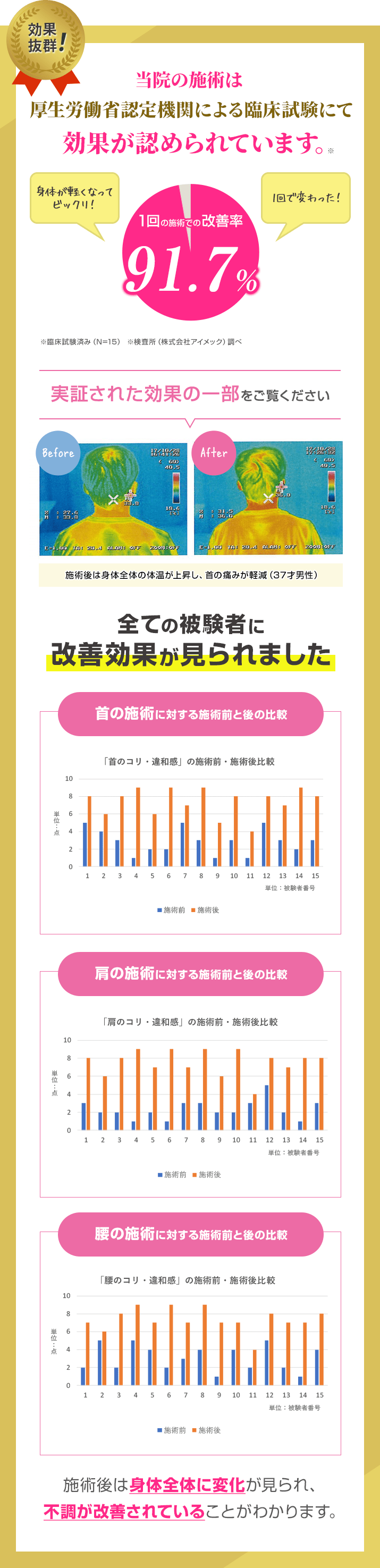施術を受けたほとんどのお客様に「一度で痛みが軽くなる」効果を実感していただいています。